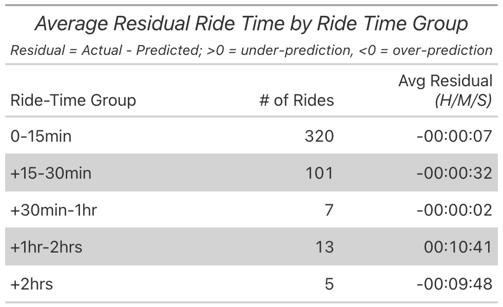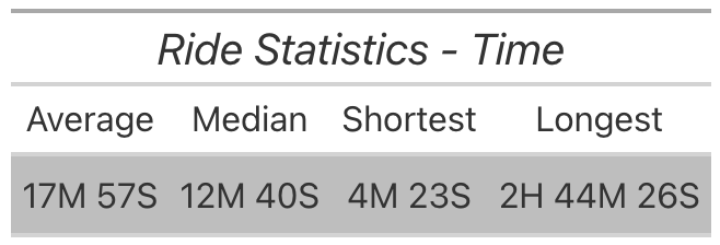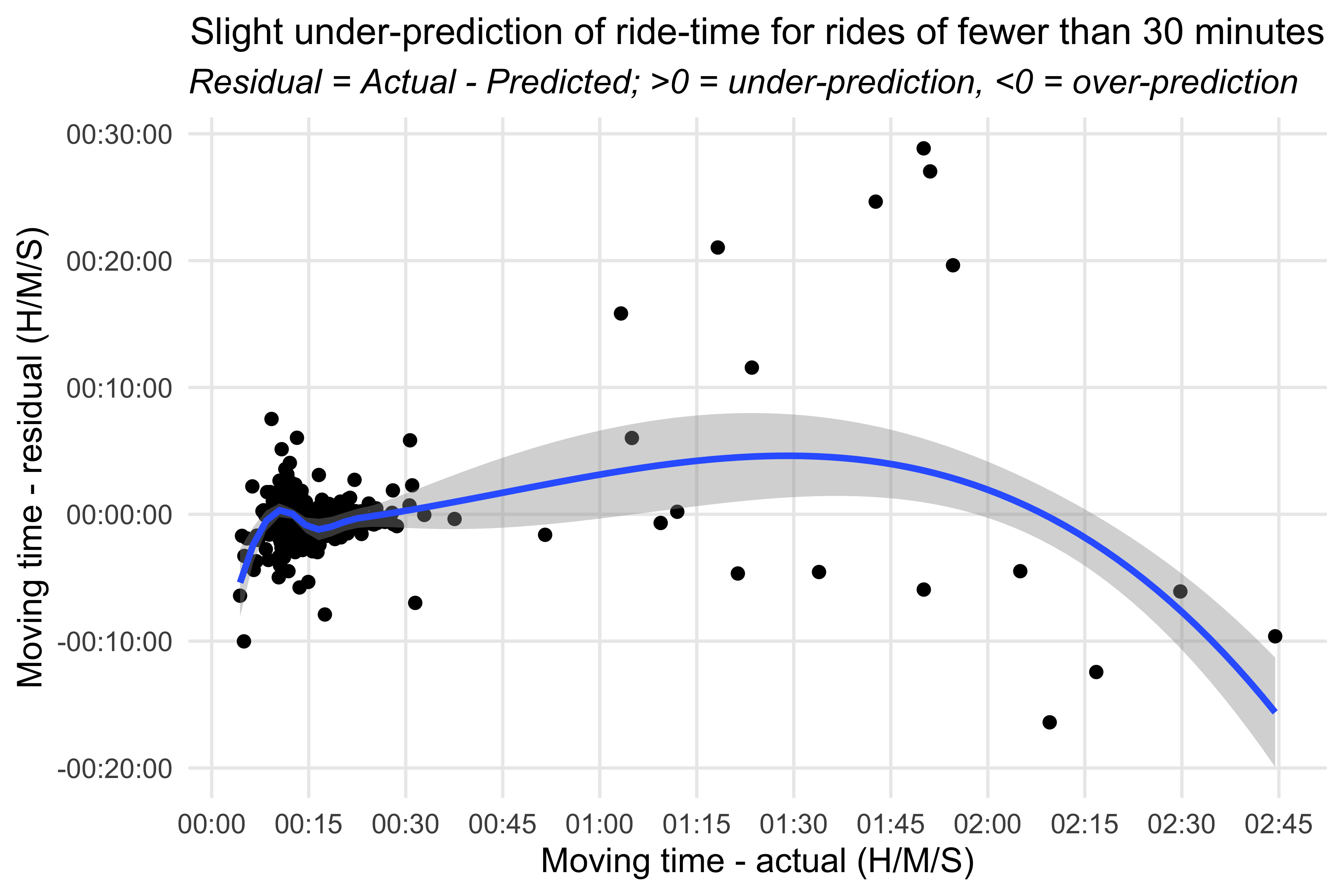 In the time model, each extra kilometer per ride added almost 190 seconds, or 3 minutes, to the ride. Each km/hour or average speed took about 2 minutes off a ride. It’s a bit counter-intuitive however that steeper average grades resulted in shorter rides. I’d need to dig deeper into the data to see why that might be happening.
