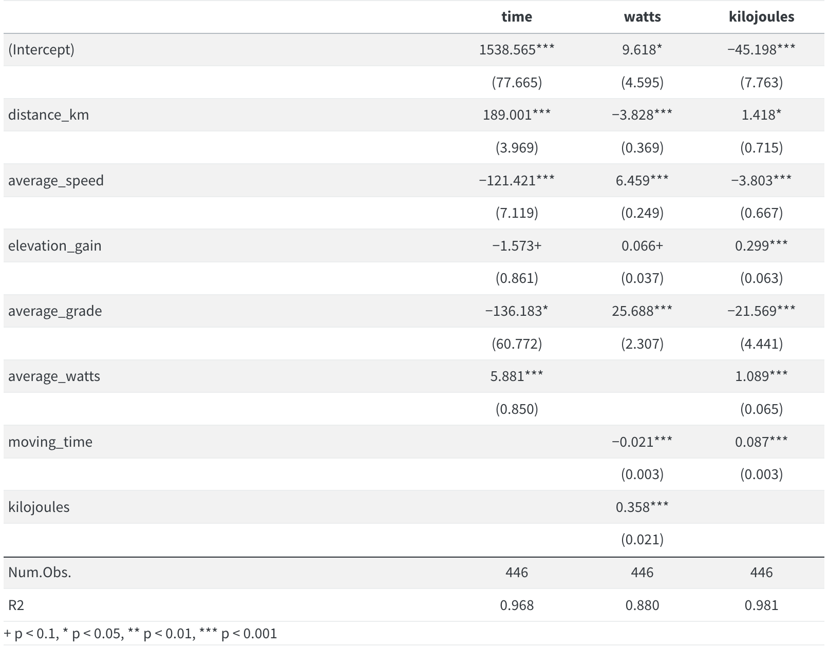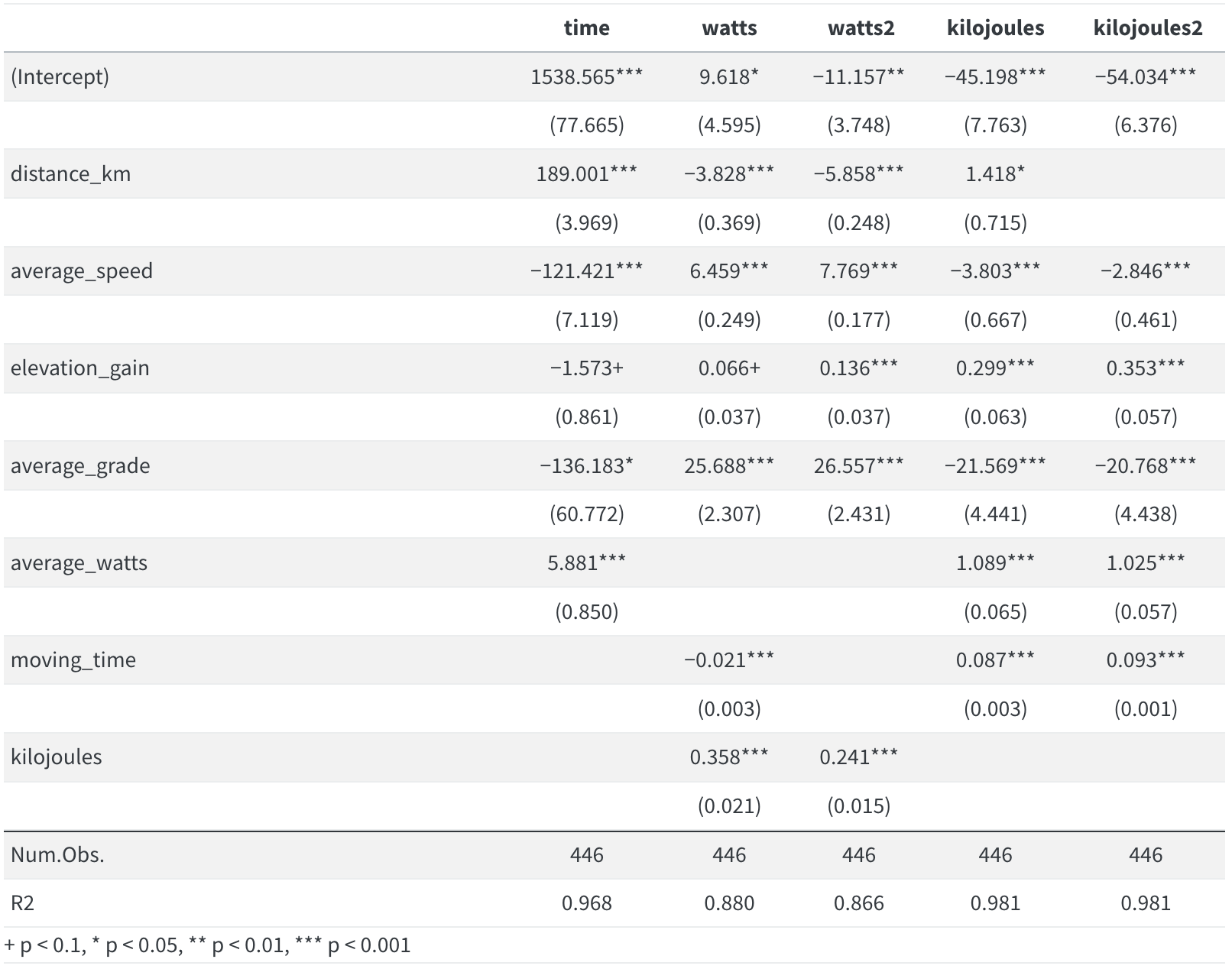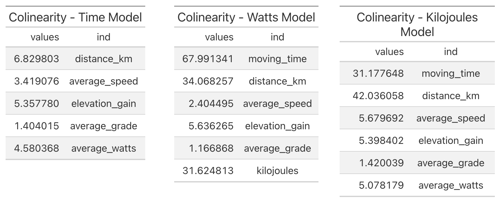 There’s some problematic colinearity with moving_time and distance_km in the watts and kilojoules models, so let’s redo models removing the variables with most colinearity.