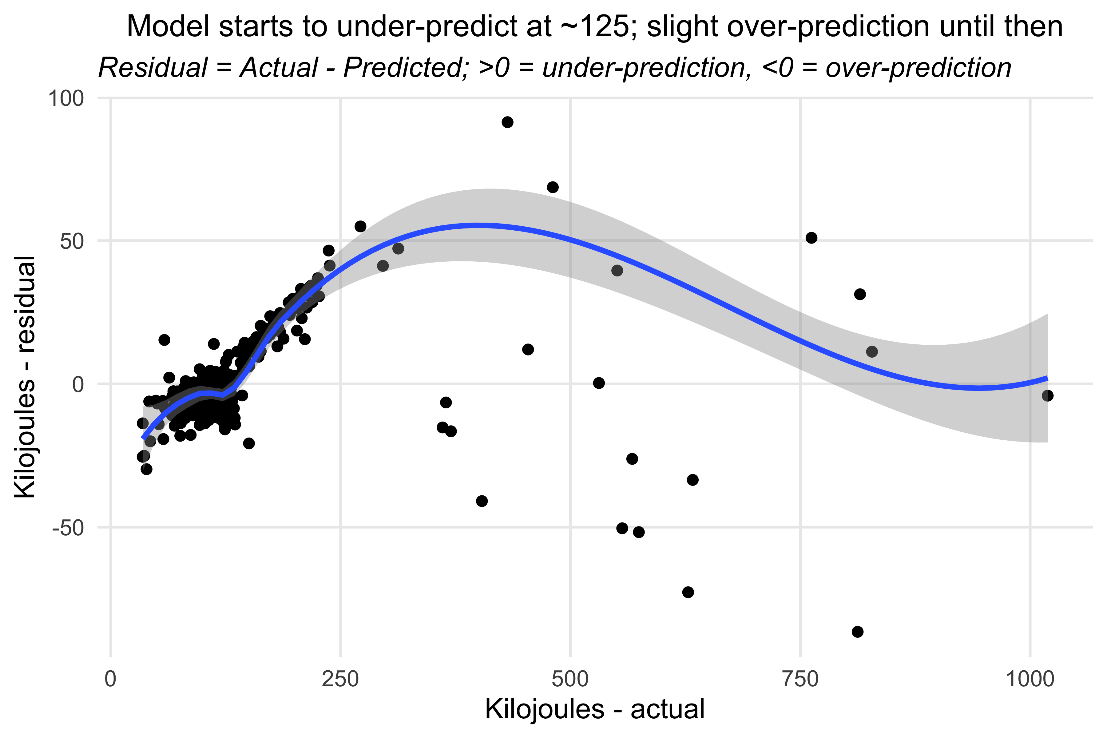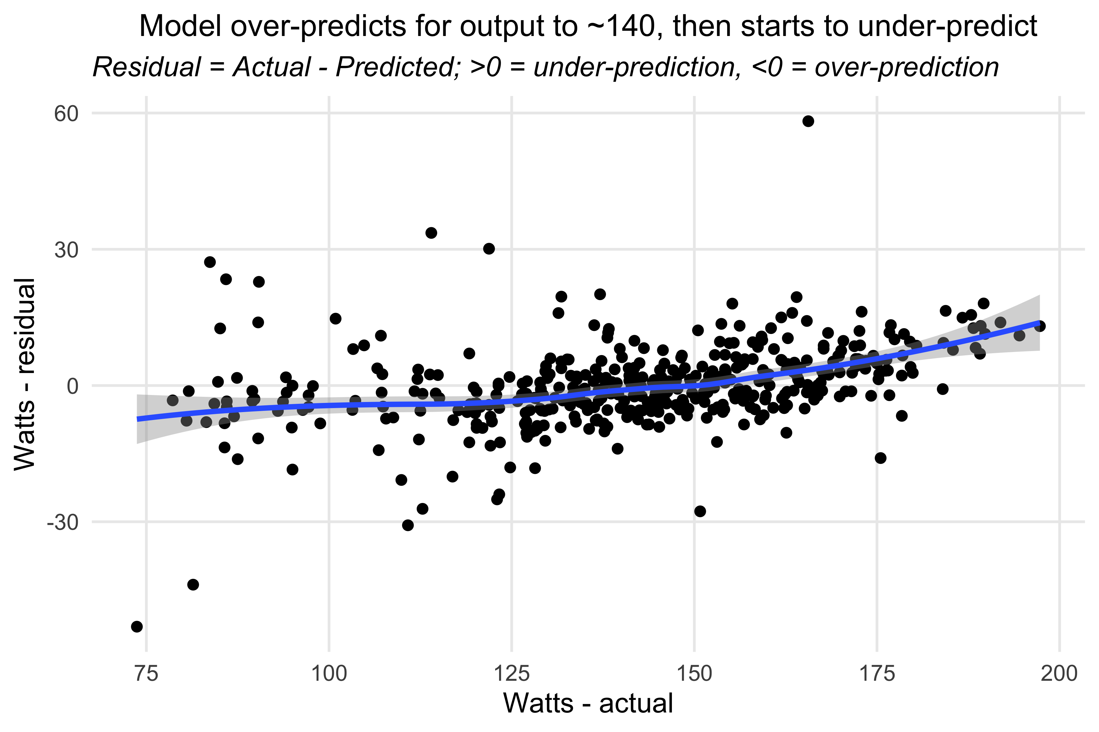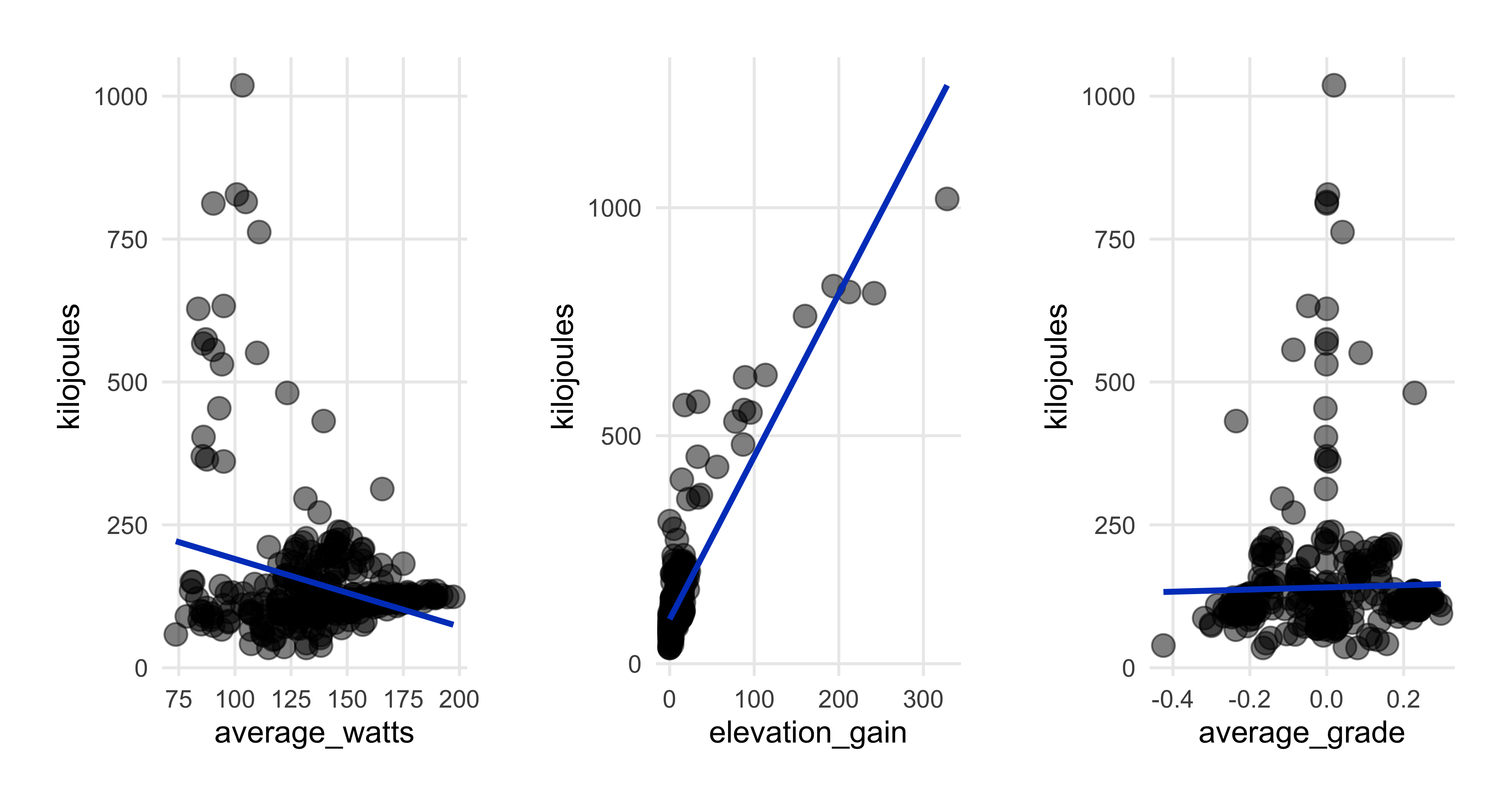 There’s some problematic colinearity with moving_time and distance_km in the watts and kilojoules models, so let’s redo models removing the variables with most colinearity.