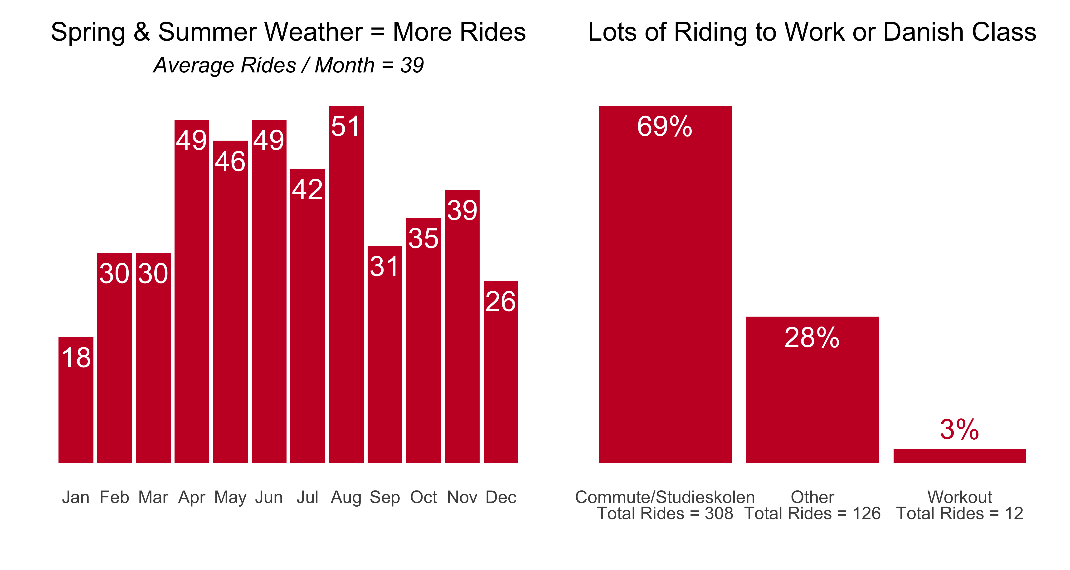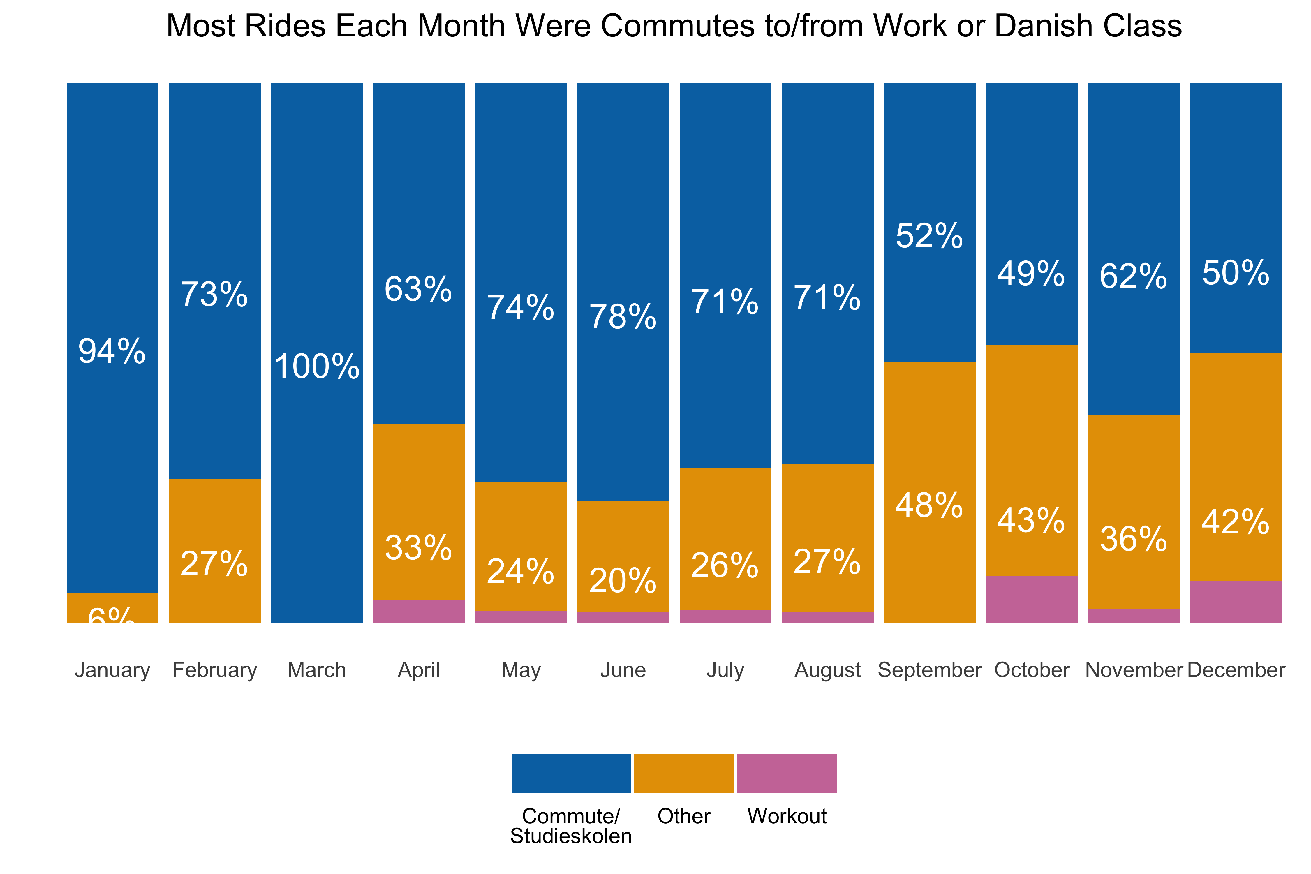 labs(x = "", y = "", title = "Most Rides Each Month Were Commutes to/from Work or Danish Class") +