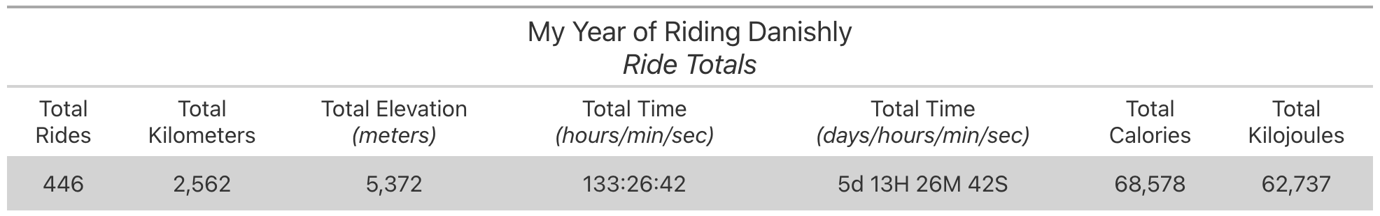 tab_header(title = md("My Year of Riding Danishly<br>*Ride Totals*"))