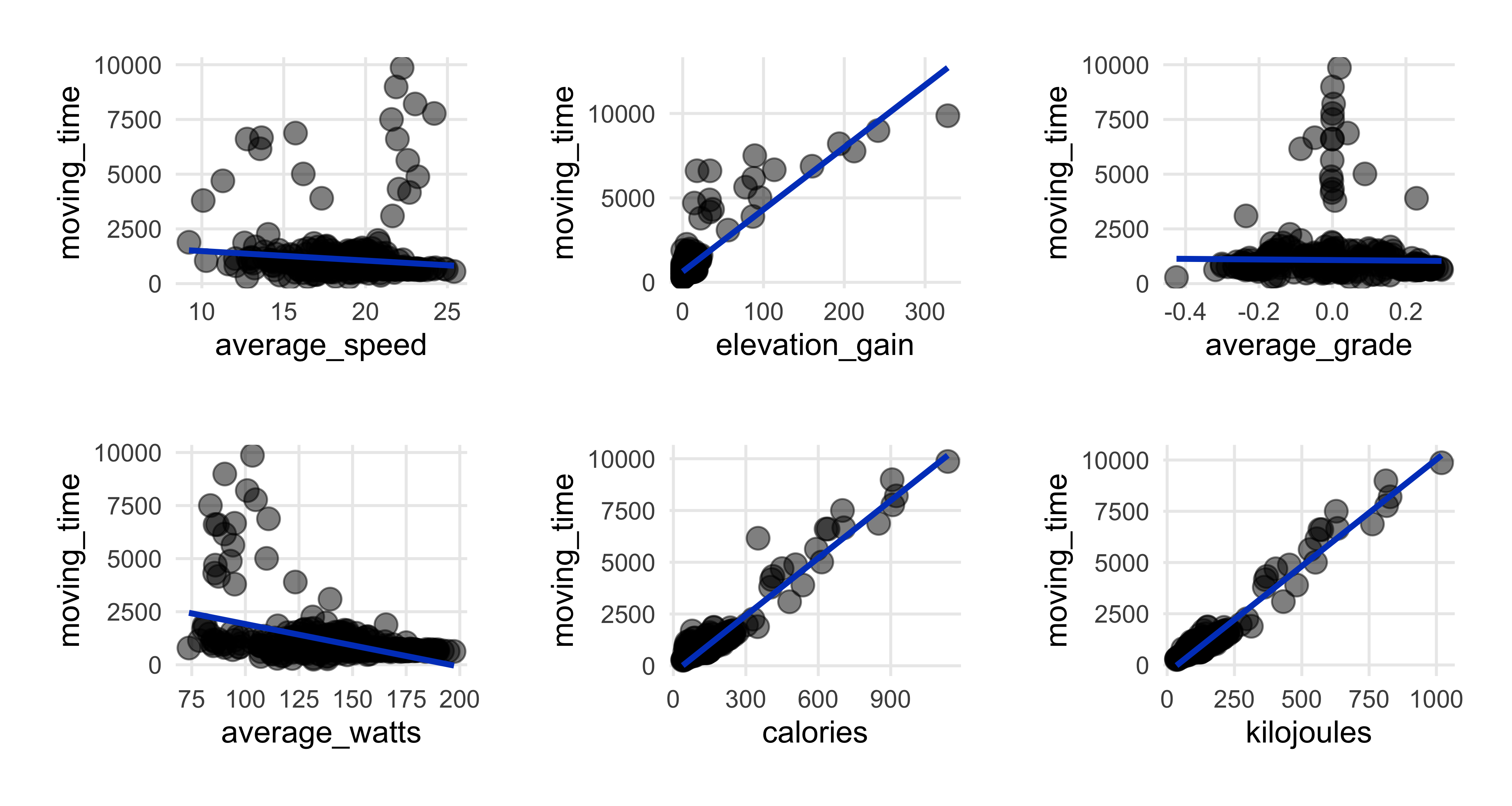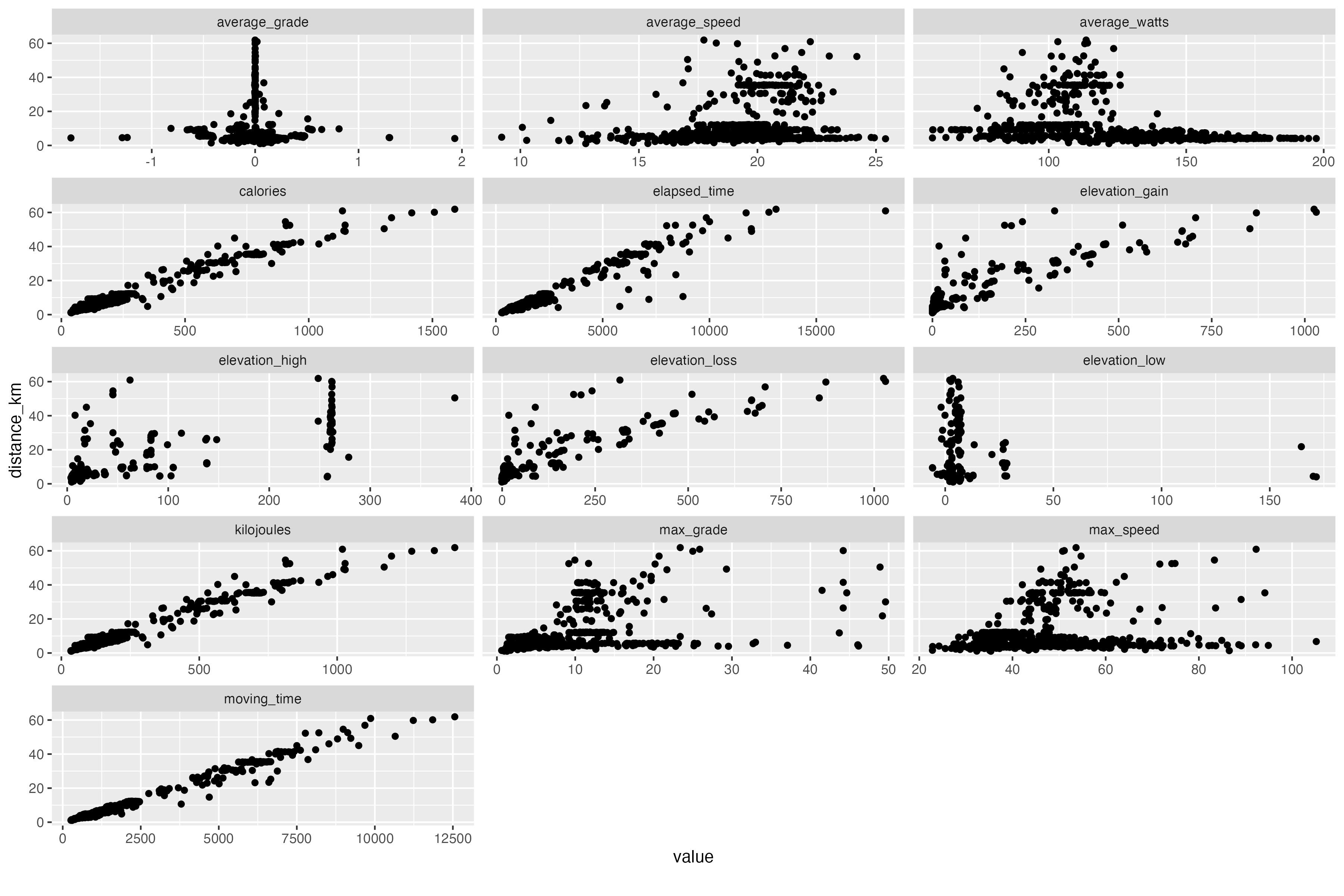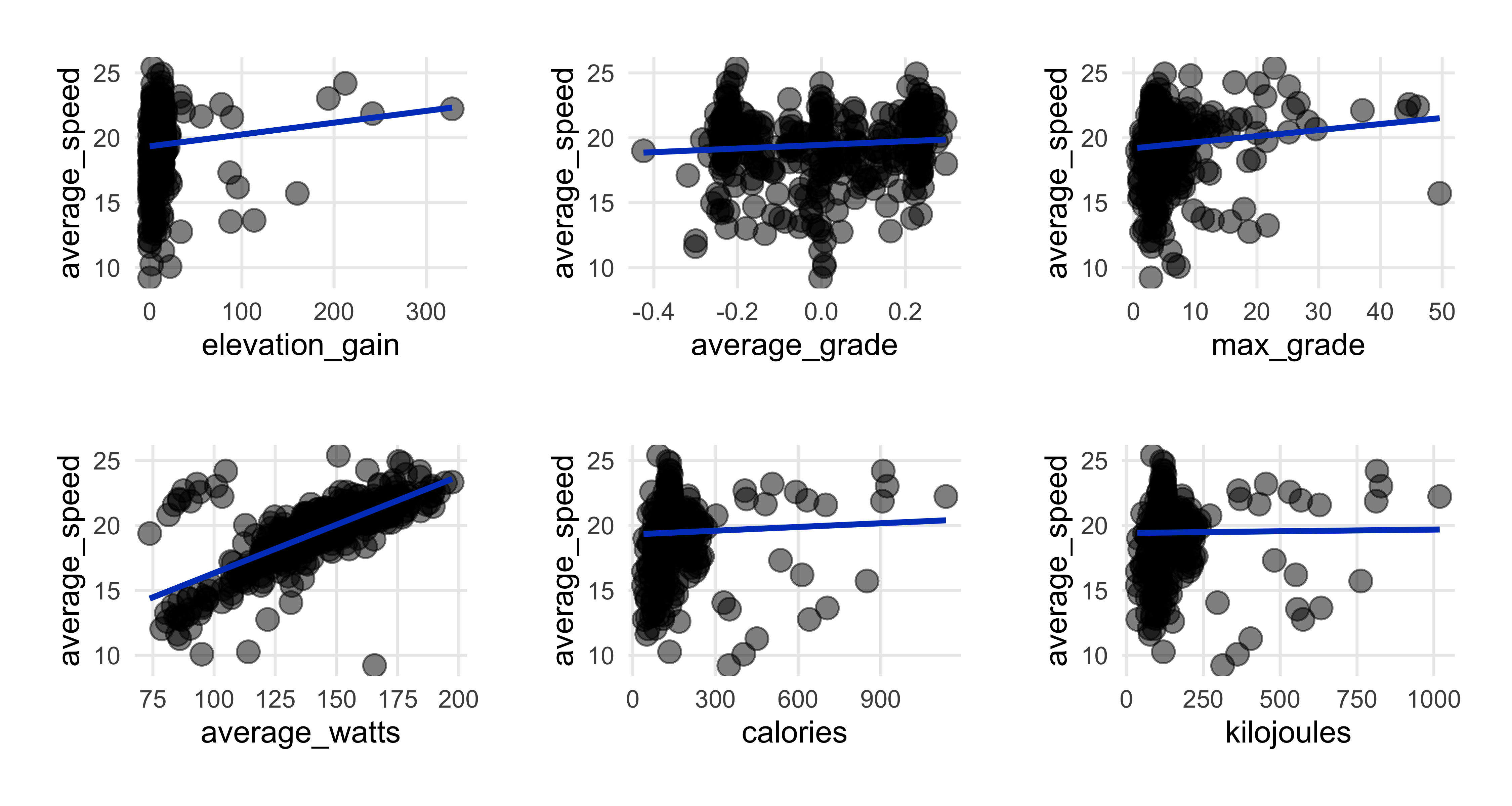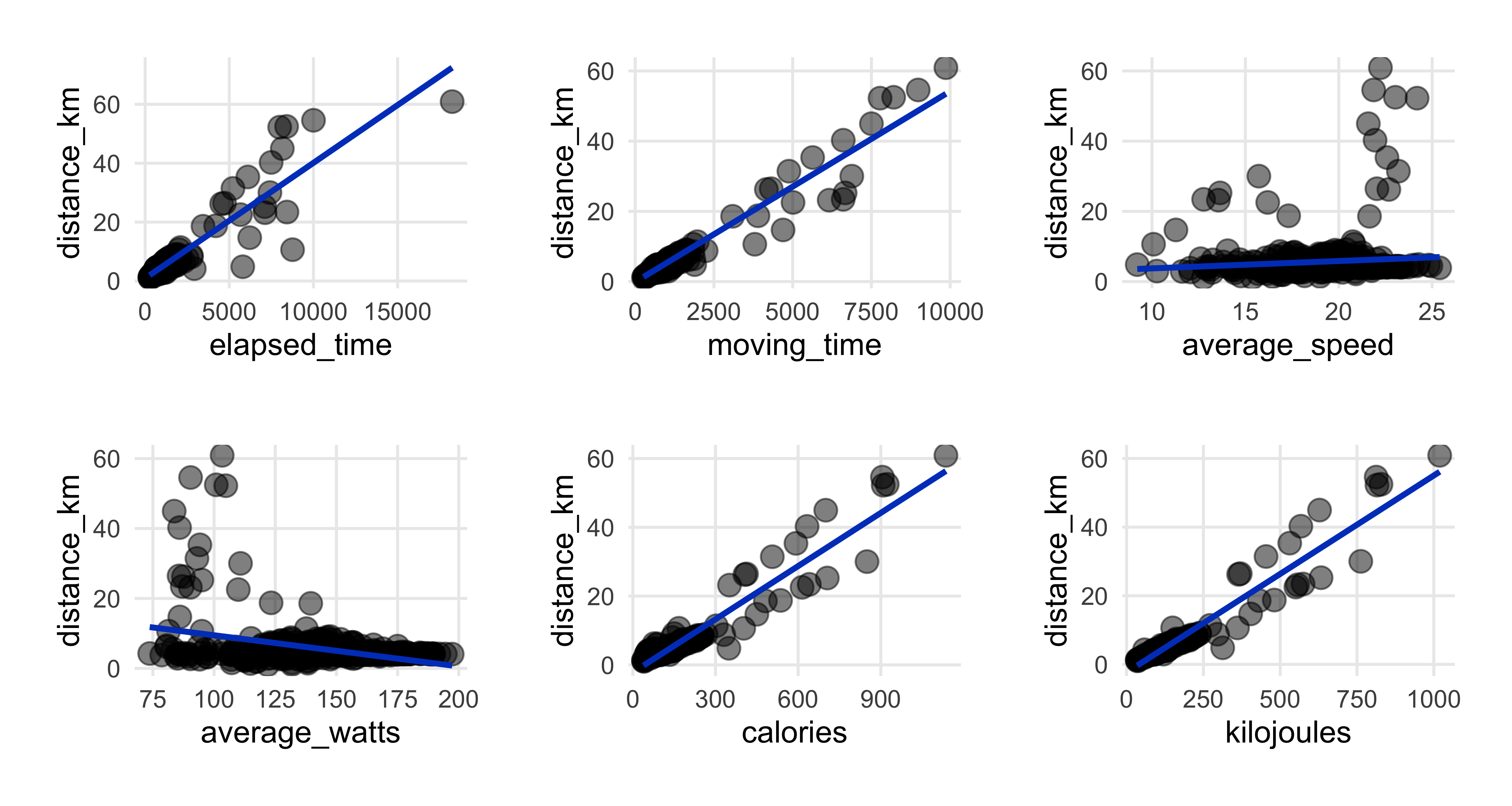DataExplorer has functionality for scatterplots, but each call only allows for one comparison y-axis variable & not much customization to the output, like a smoothing line.plot_scatterplot(strava_data_filter, by = "distance_km", nrow = 6L)